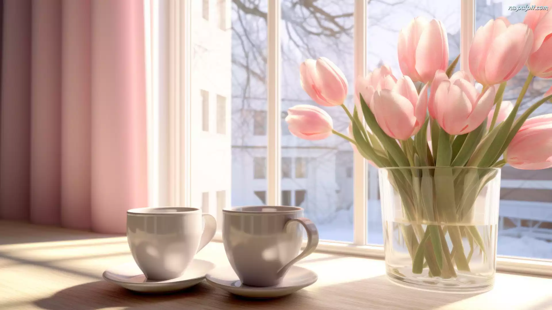 Dwie, Tulipany, Filiżanki, Kwiaty, Okno, Parapet, Różowe, Wazon Na Pulpit