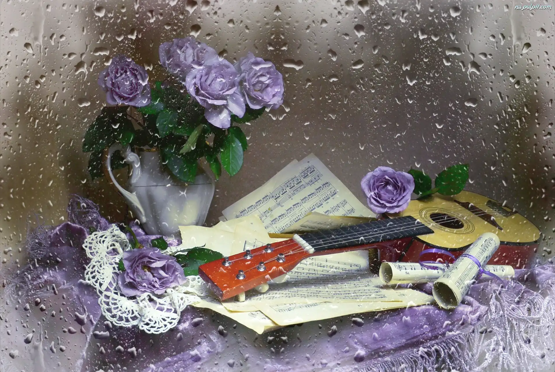 Krople, Wazon, Nuty, Róże, Bukiet, Kompozycja, Gitara