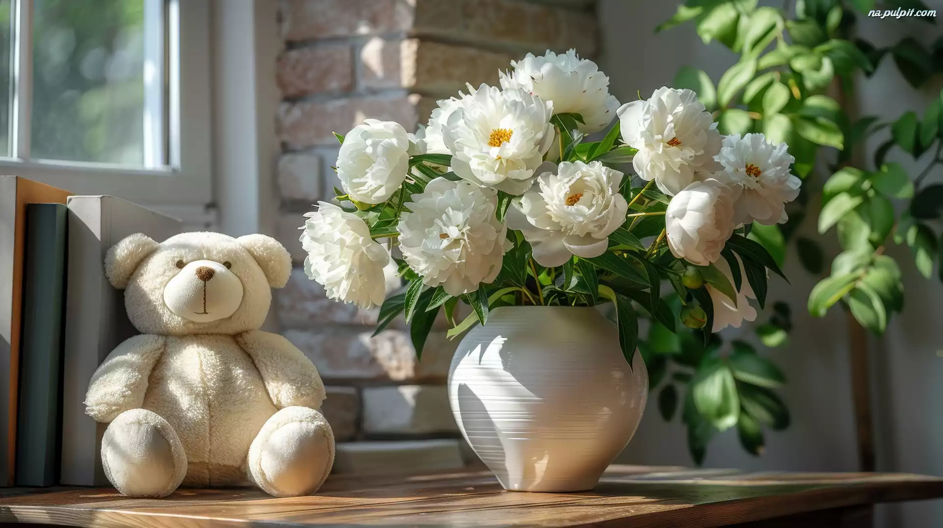 Zabawka, Bukiet, Piwonie, Wazon, Białe, Miś Na Pulpit