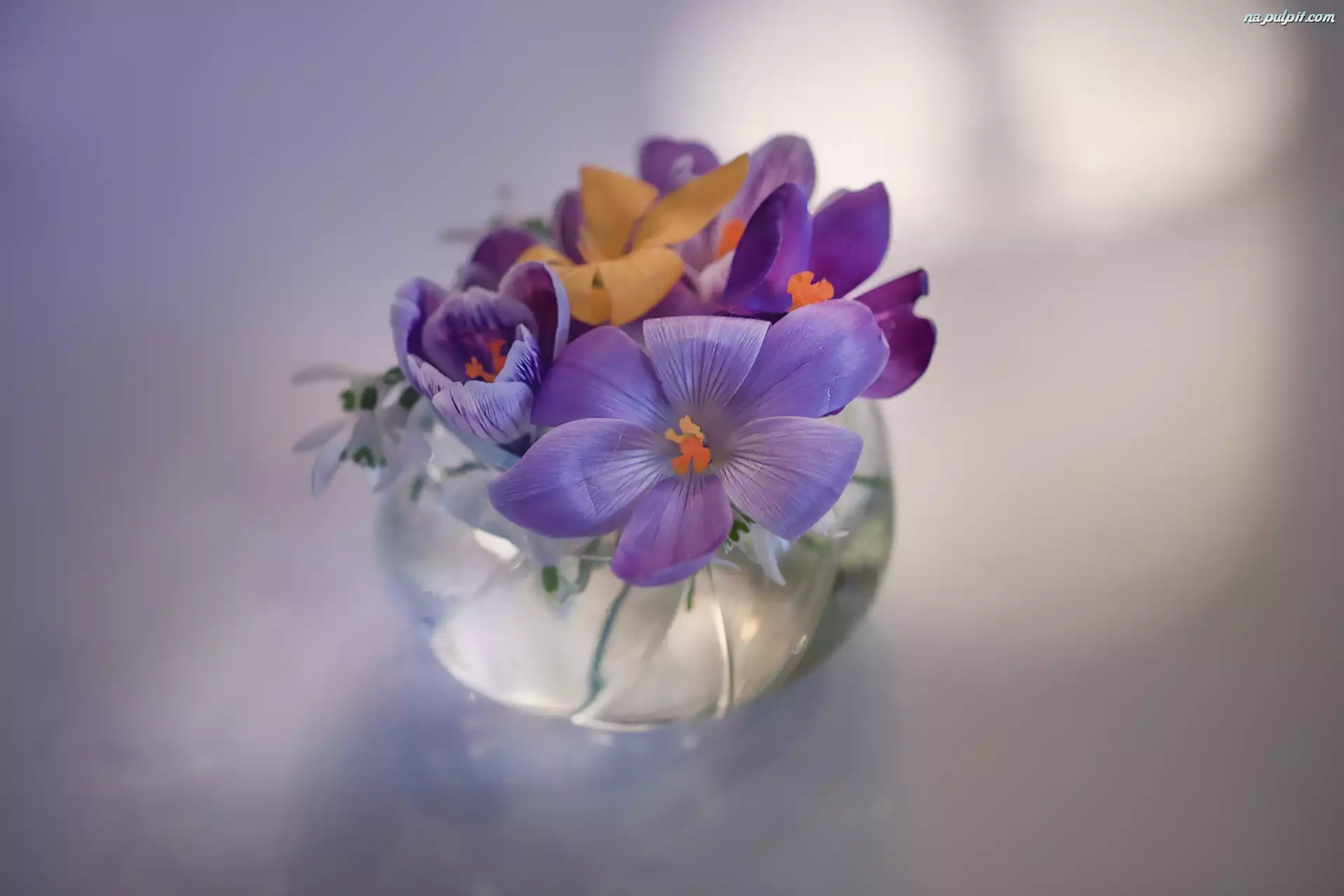 Krokusy, Kwiaty, Wiosna, Wazonik