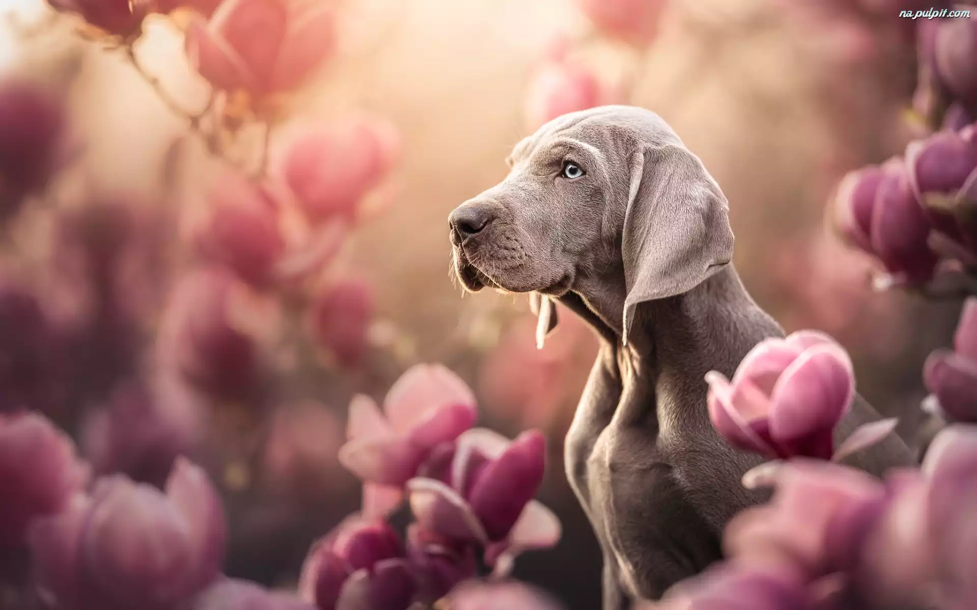 Magnolie, Pies, Wyżeł weimarski, Rozmycie, Kwiaty Na Pulpit