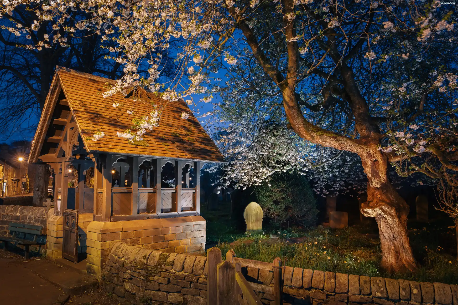 Wejście, Ogrodzenie, Baslow, Kościół św. Anny, Drzewo, Kwitnące, Cmentarz, Hrabstwo Derbyshire, Anglia, Drzewo, Noc, Lychgate Na Pulpit |