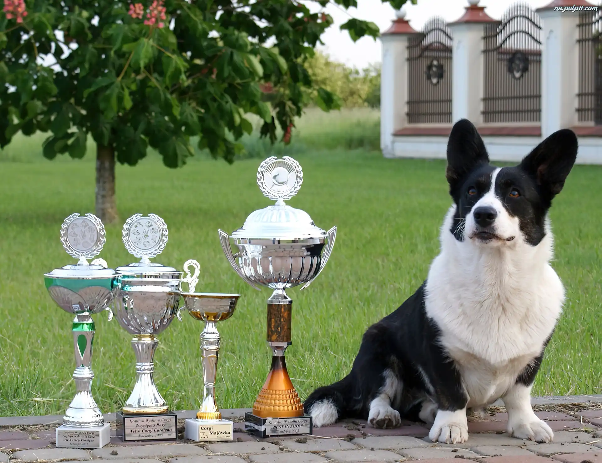 Welsh corgi cardigan, puchary Zabawa, Szczeniaki, Welsh corgi pysk, Welsh corgi cardigan psy, cztery, Welsh corgi cardigan Trawa, Piesek, Zapatrzony, Ścieżka trawa, Welsh corgi cardigan, zielona Fotel, Psy, Welsh corgi cardigan Welsh corgi cardigan, plaża