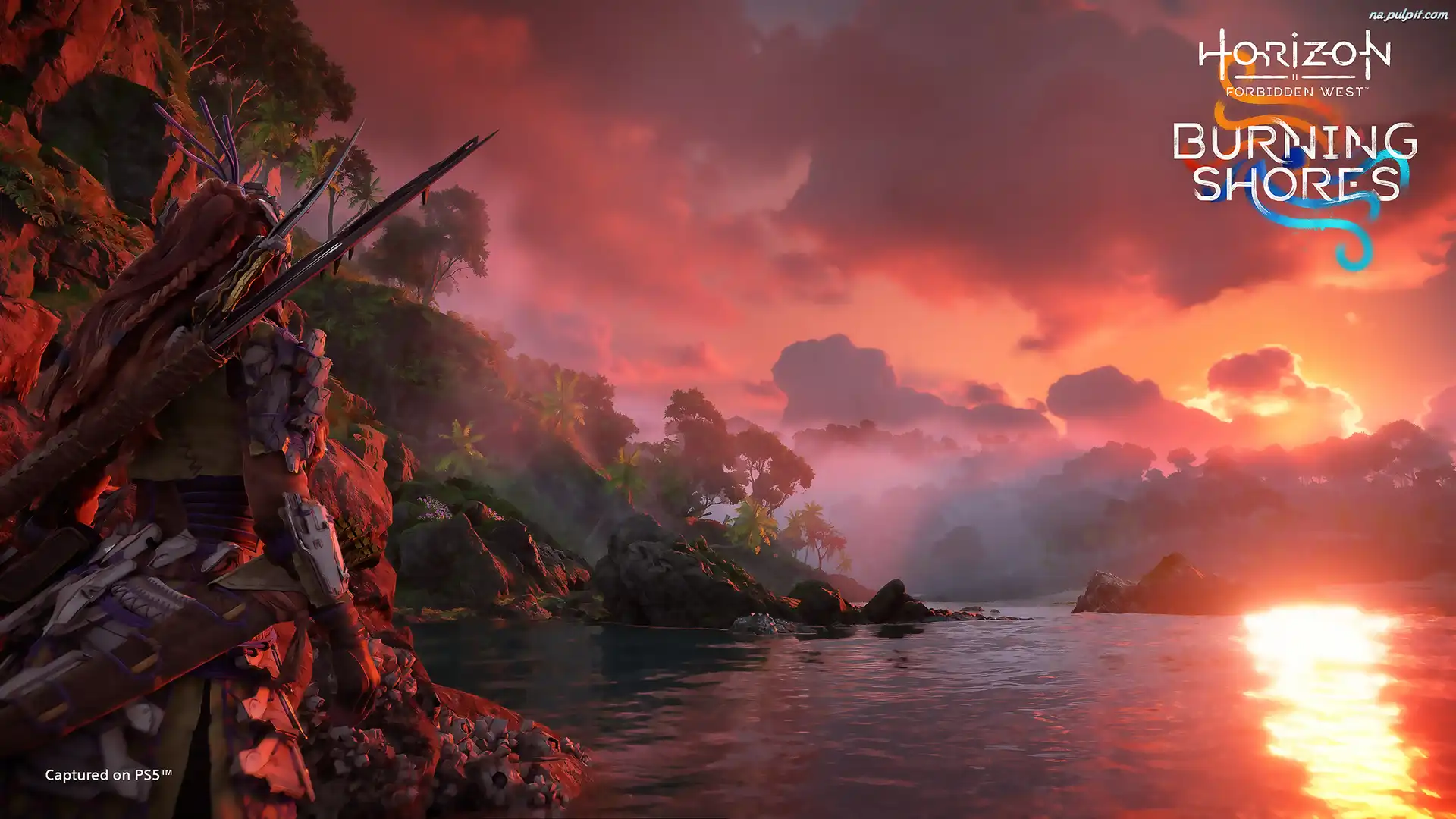 Zachód, Plakat, Burning Shores, Aloy, Wyspa, Postać, Horizon Forbidden West, Słońce, Palmy Na Pulpit |