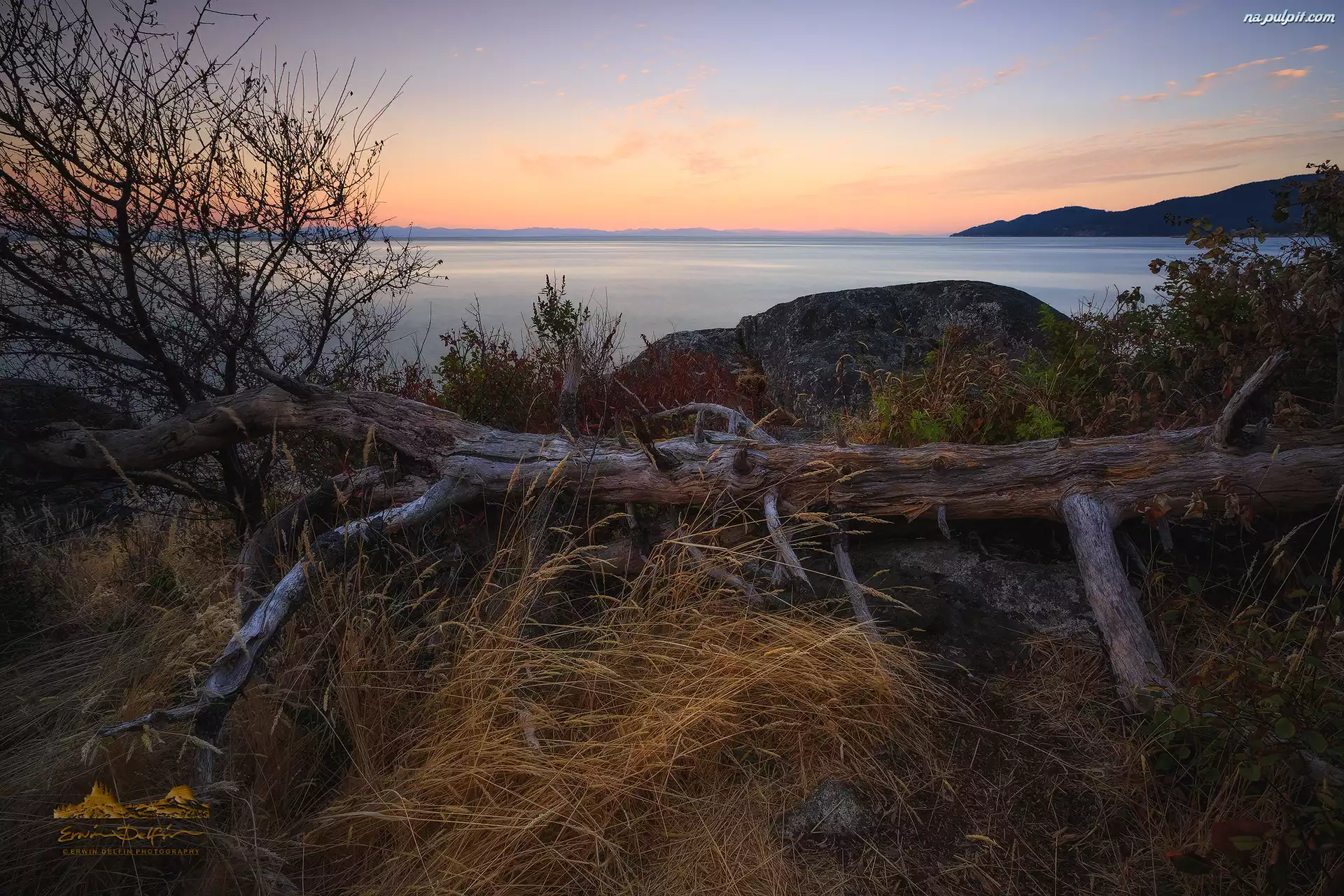Morze, Skały, Konar, Trawy, West Vancouver, Kolumbia Brytyjska, Kanada, Drzewo, Zachód słońca, Whytecliff Park Na Pulpit |