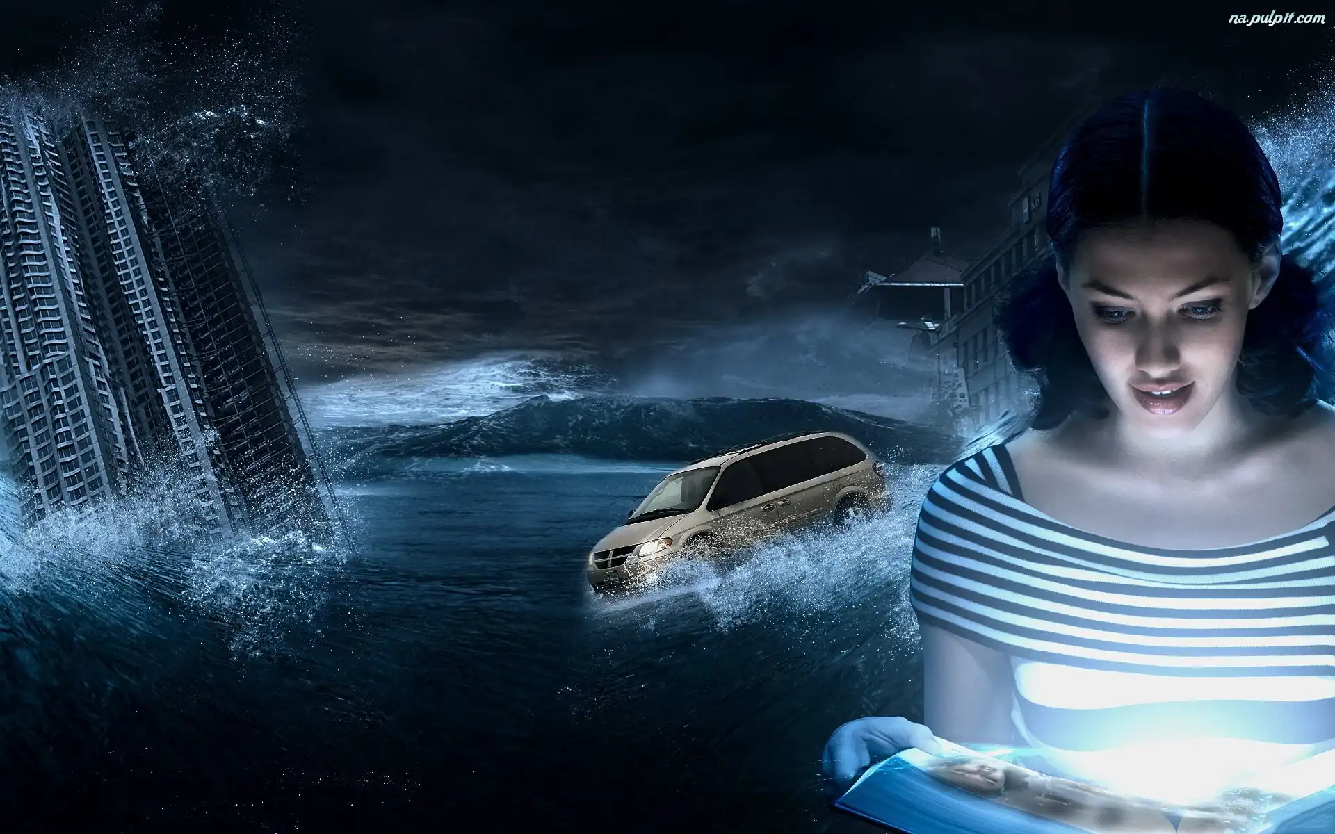 Świat, Chmur, Samochód, Kobieta, Zalany, Drapacze