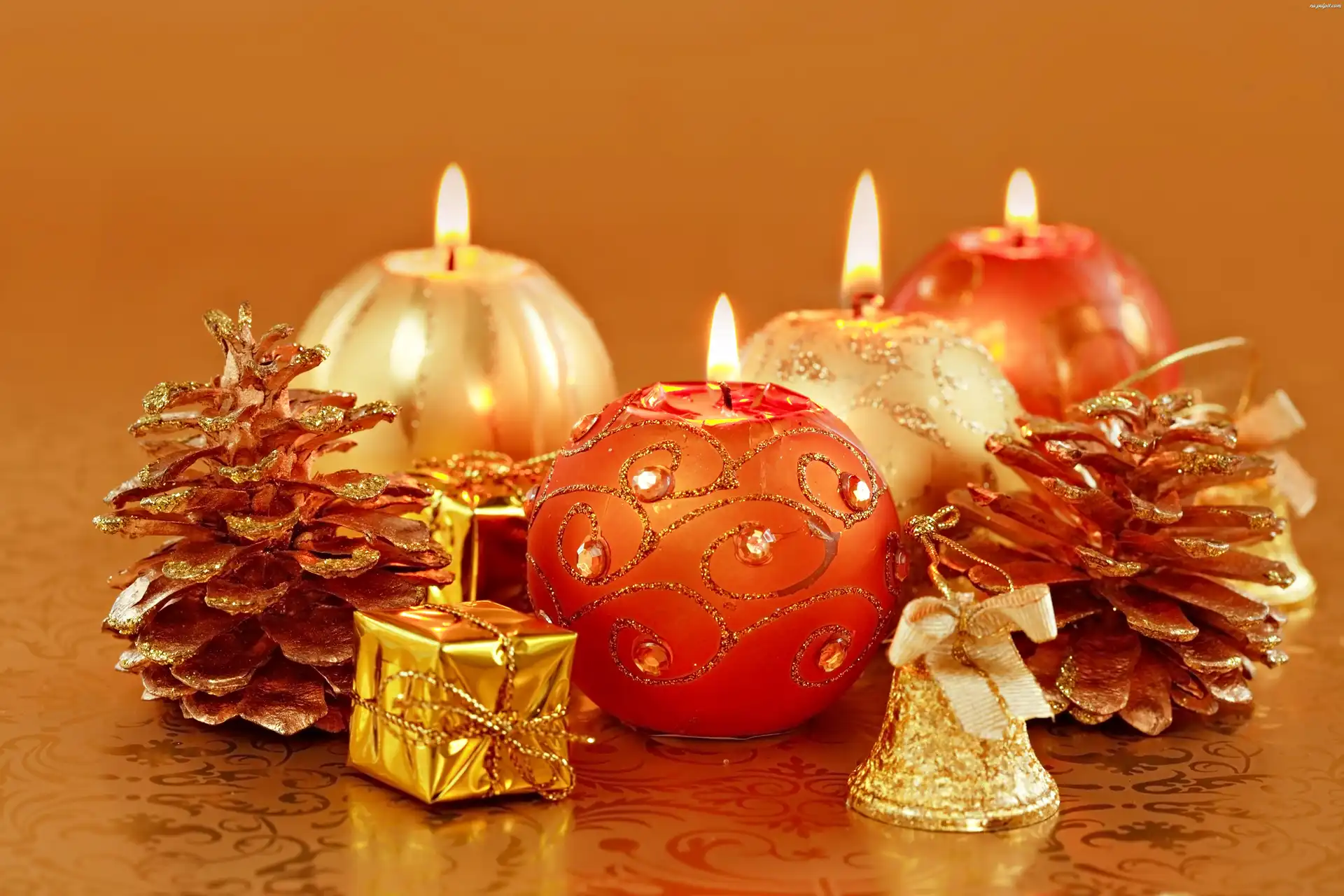 Świąteczna, Złoto, Szyszki, Świece, Dekoracja, Ozdoby