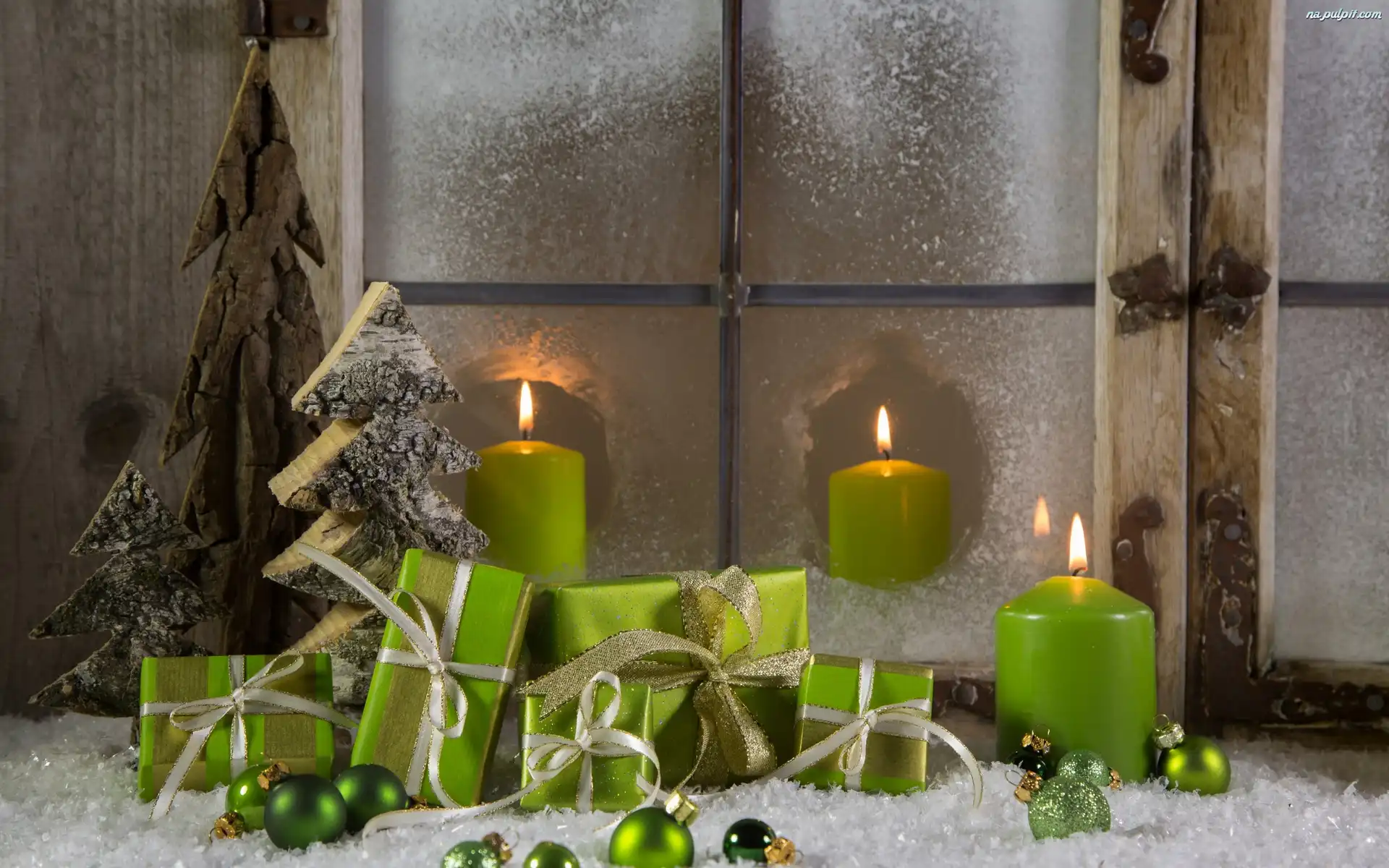 Okno, ÅšwiÄ…teczne, Prezenty, Åšwieczki, Zielone, Kompozycja, Bombki