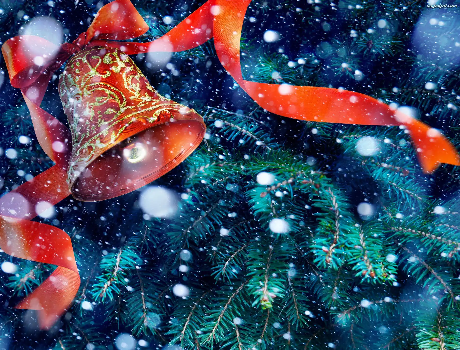 Śnieg, Gałązki, Dzwonek, Świąteczny, Świerku