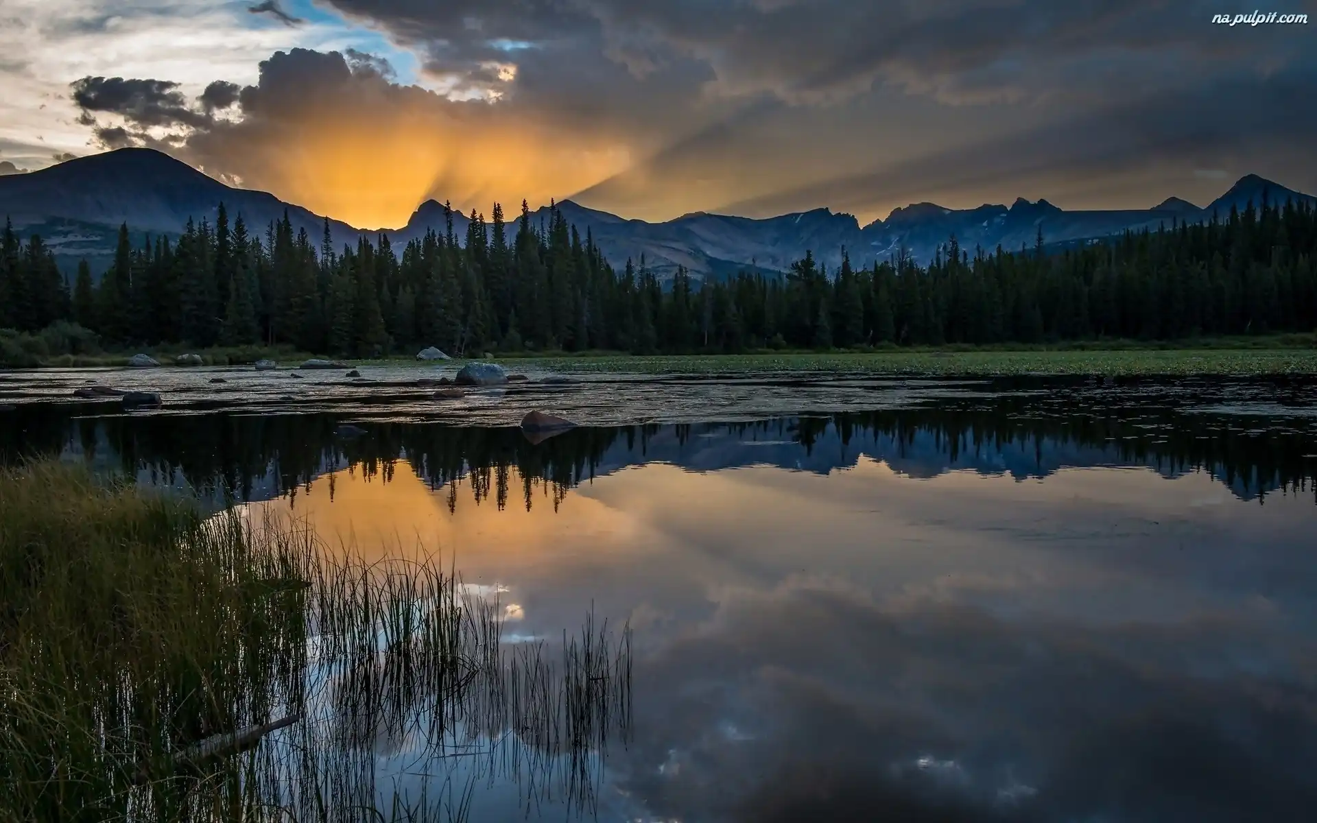 Światło, Promienie Słońca, Jezioro, Góry, Przebijające