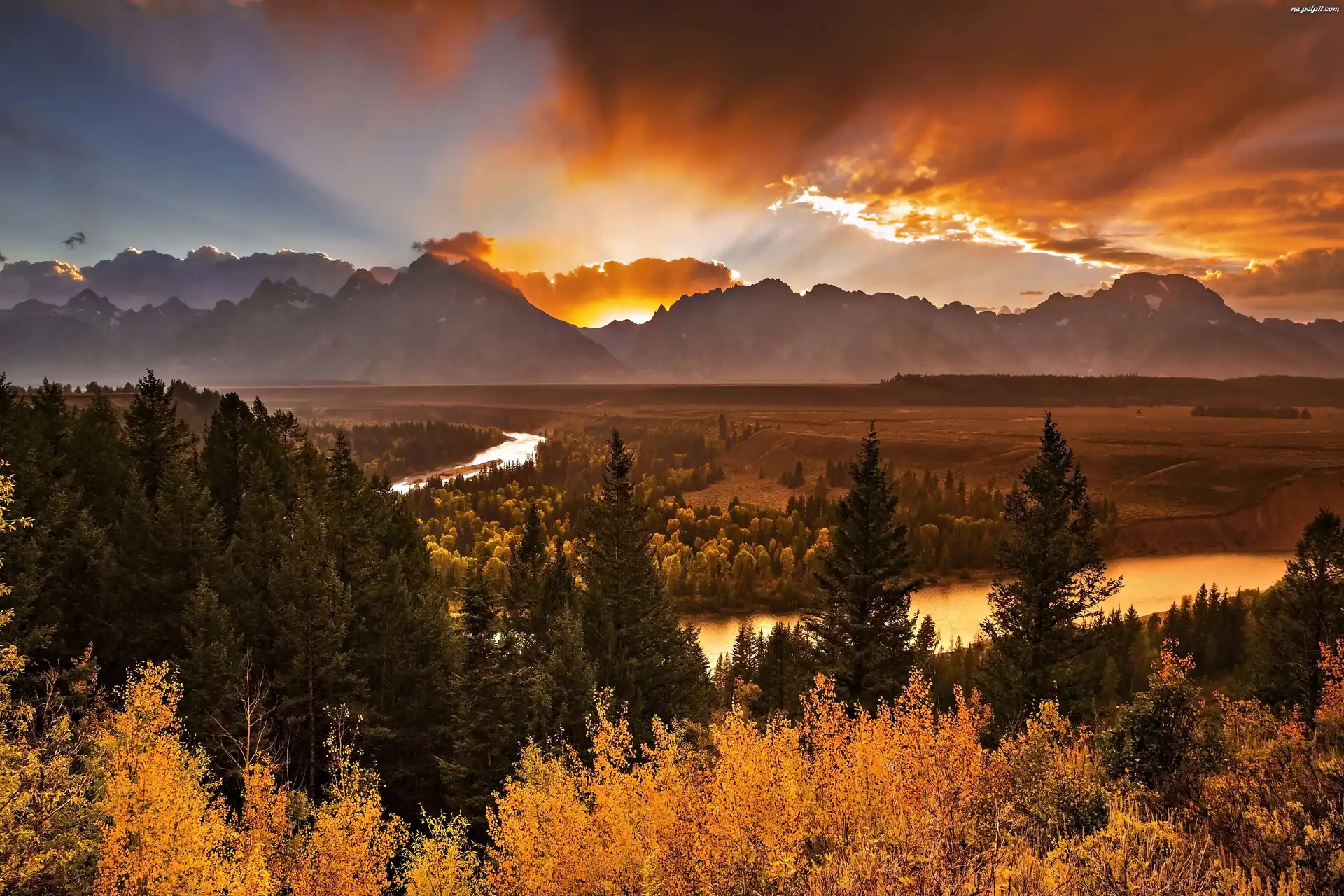 Światło, Las, Przebijające, Góry, Rzeka, Jesień, Chmury