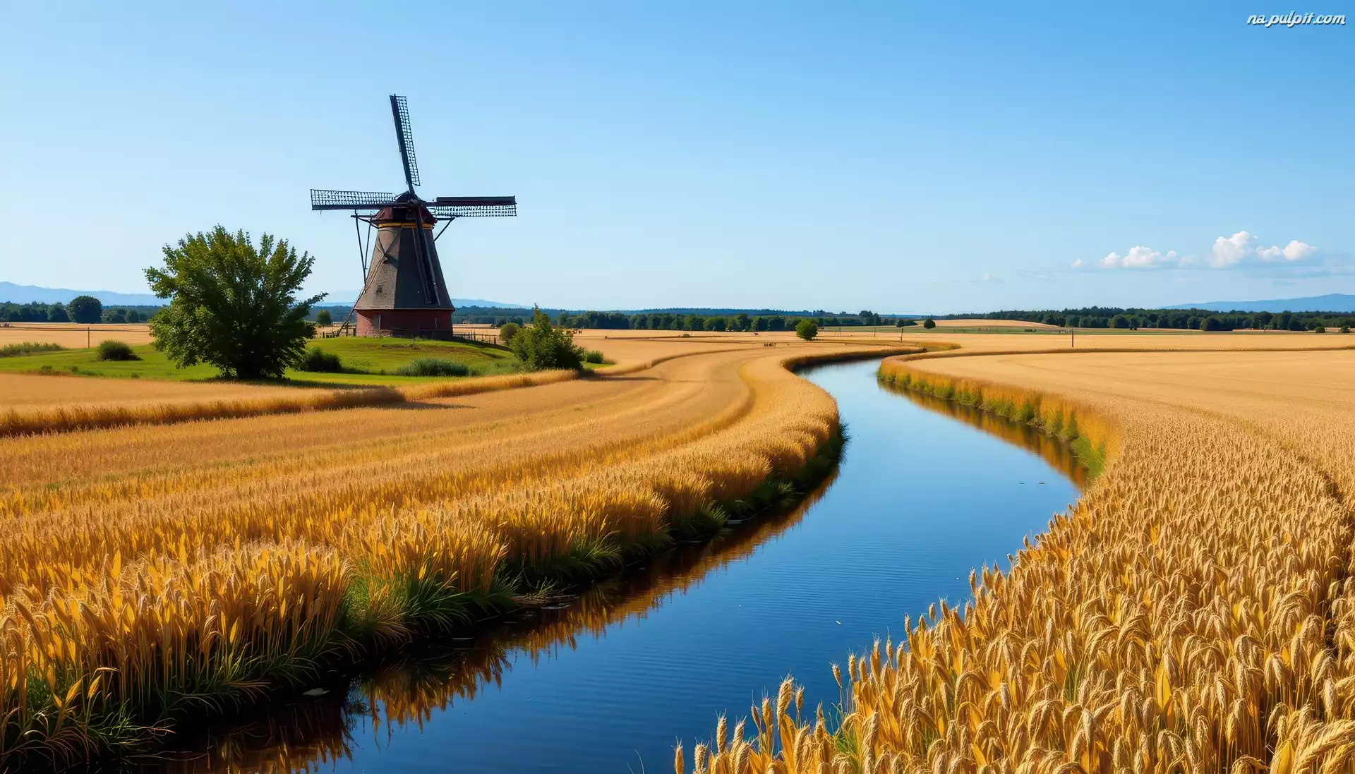 Lato, Pole, Rzeka, Wiatrak, Zboże, Grafika Na Pulpit