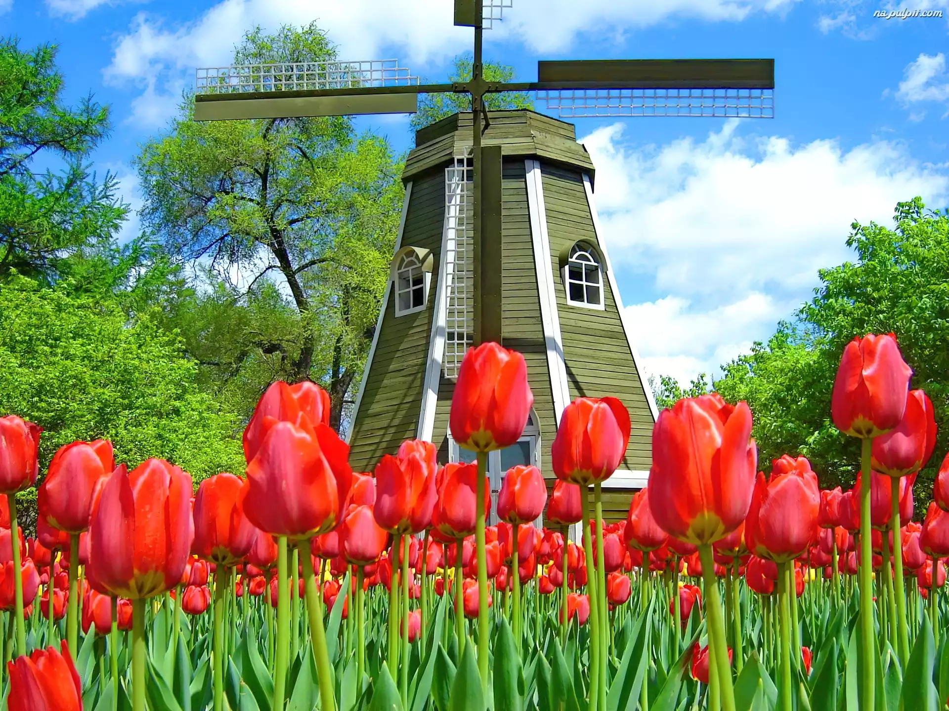 Tulipany, Wiatrak, Czerwone Na Pulpit