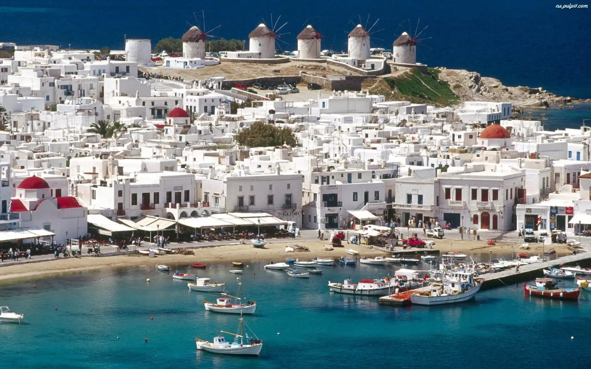 Wiatraki, Mykonos, Plaża, Grecja Na Pulpit