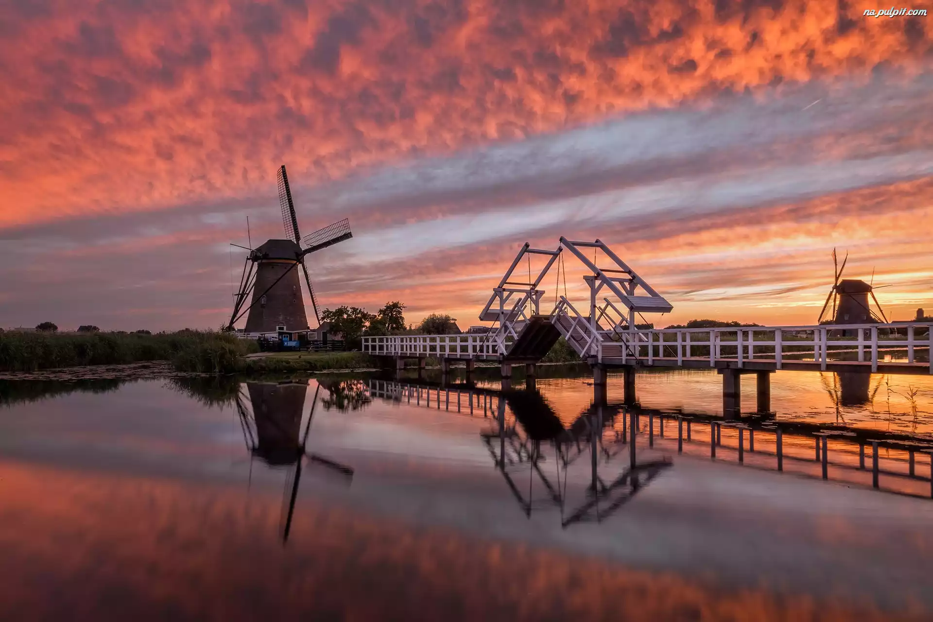 Rzeka, Region Alblasserwaard, Zachód Słońca, Most, Wieś Kinderdijk, Holandia, Wiatraki Na Pulpit