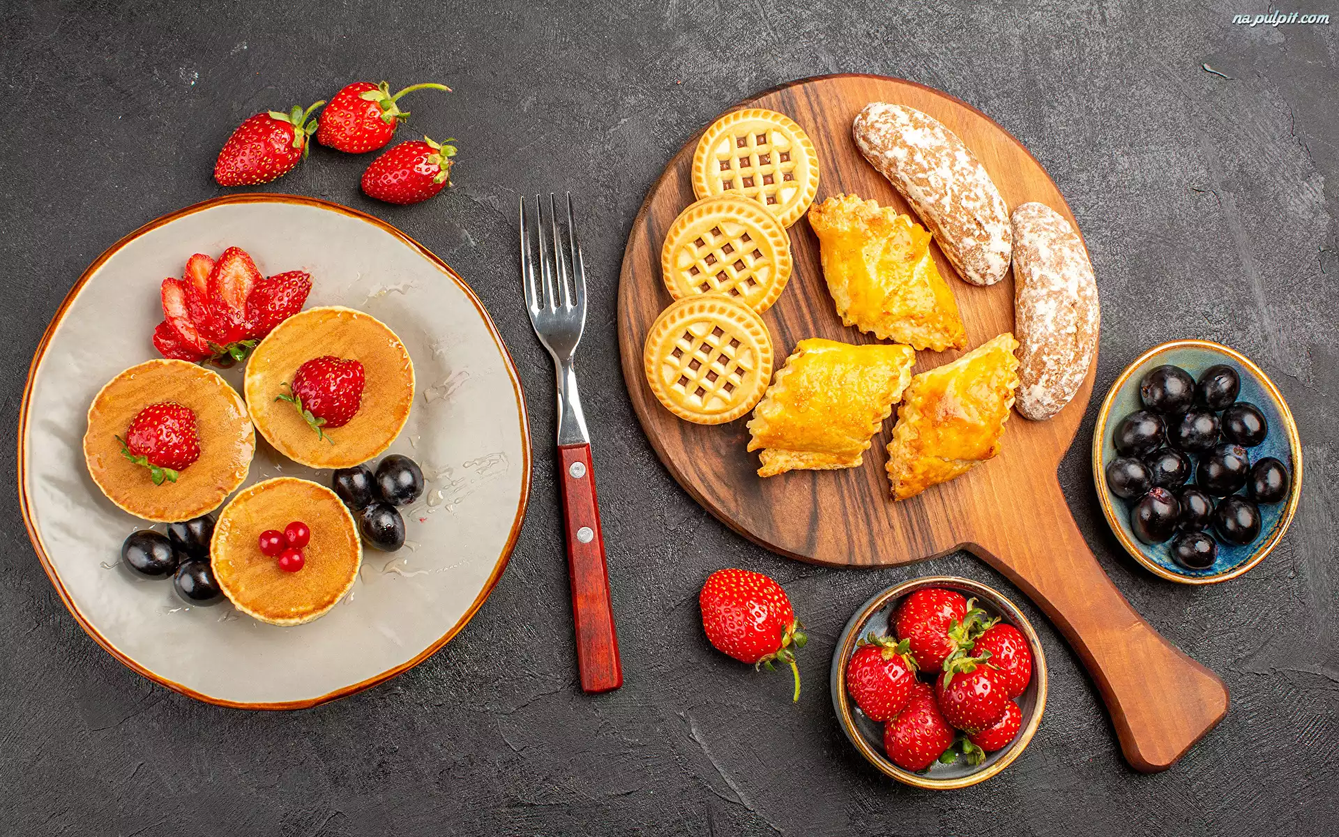 Widelec, Kompozycja, Truskawki, Talerz, Deska, Jagody, Owoce, Ciastka, Babeczki Na Pulpit