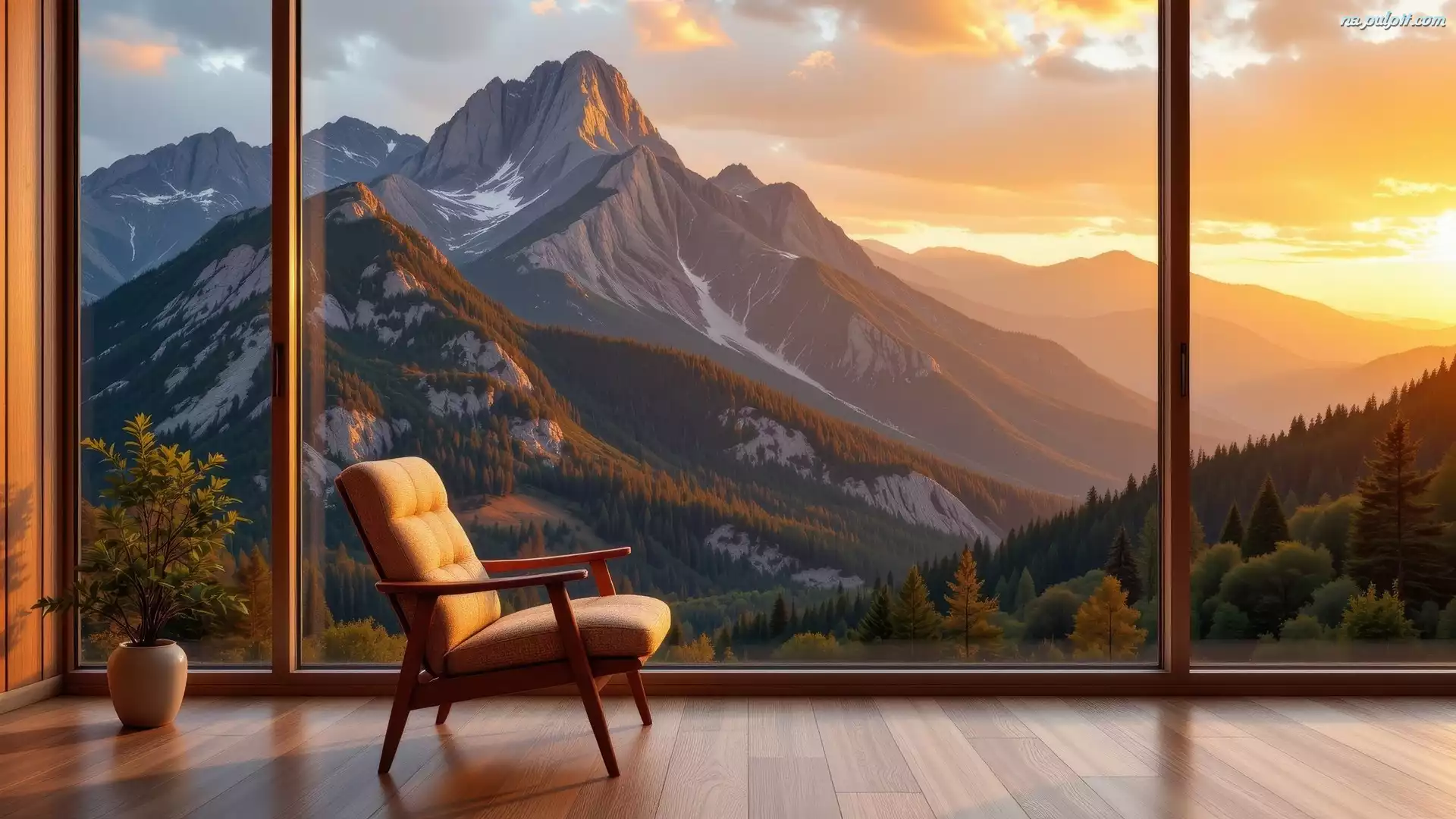 Widok, Wazon, Góry, Pokój, Zachód słońca, Drzewa, Fotel, Okno