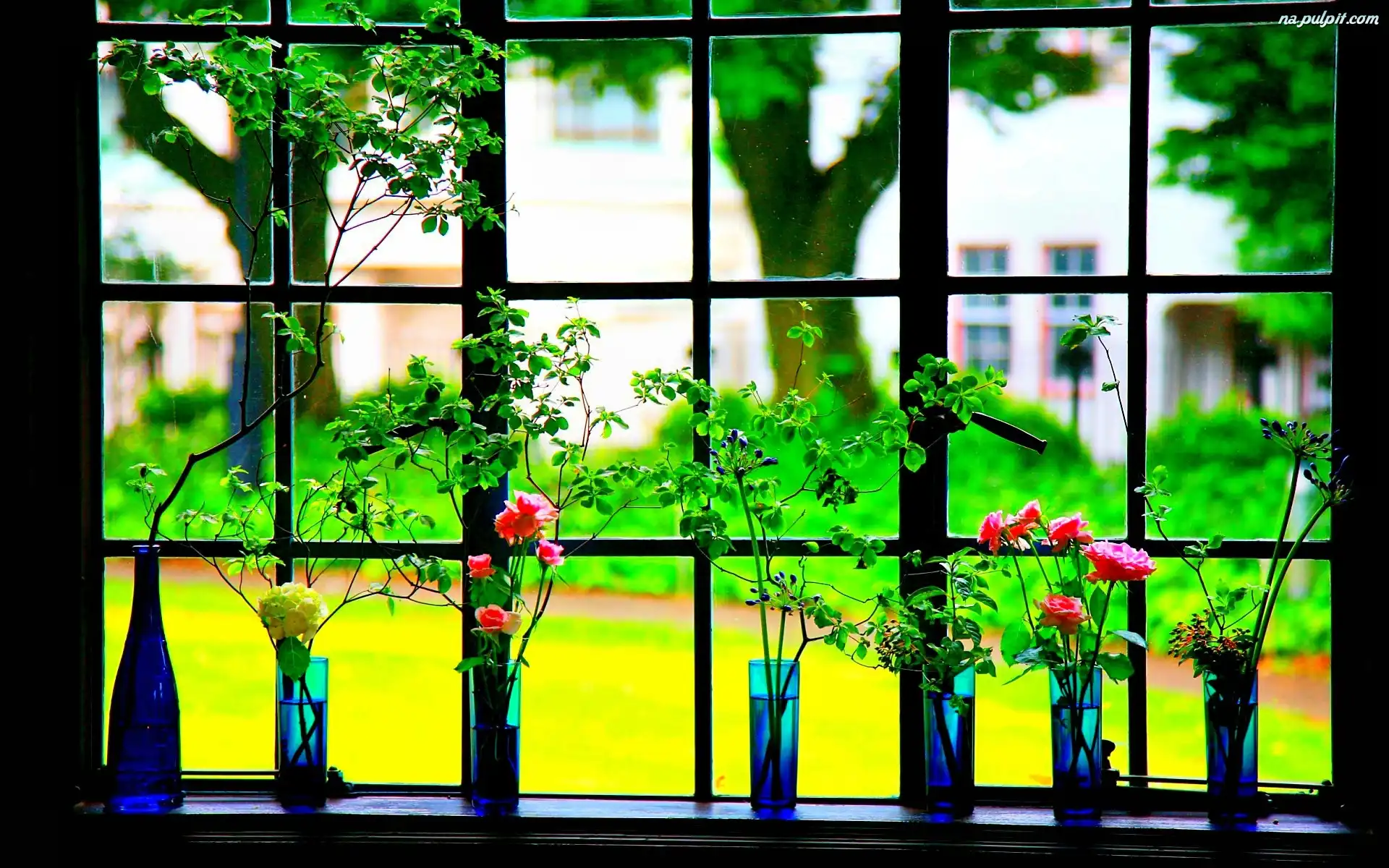 Widok, Rośliny, Wazoniki, Okno, Róże