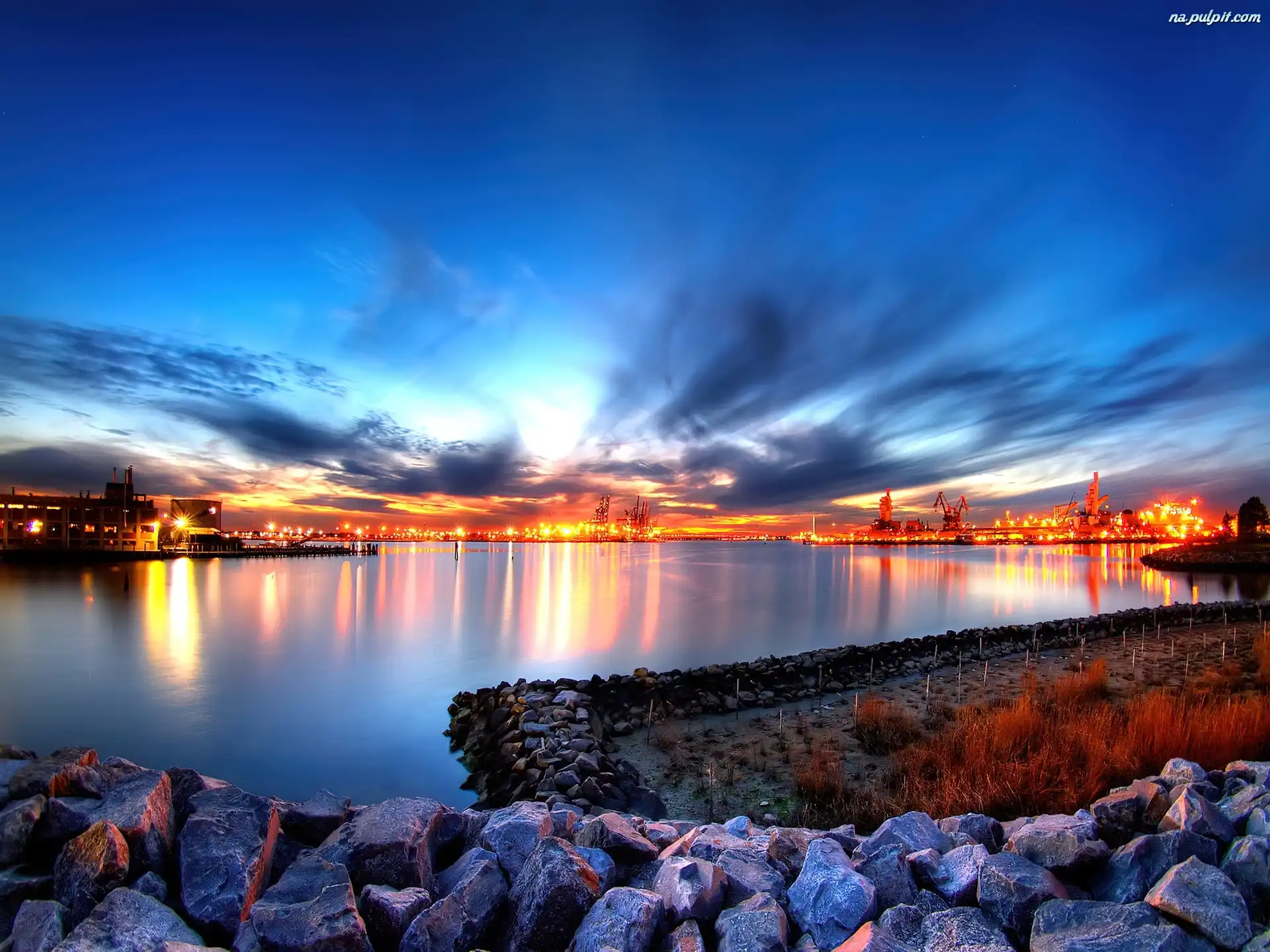 Widok, Miasto, Rzeka, Światła Na Pulpit