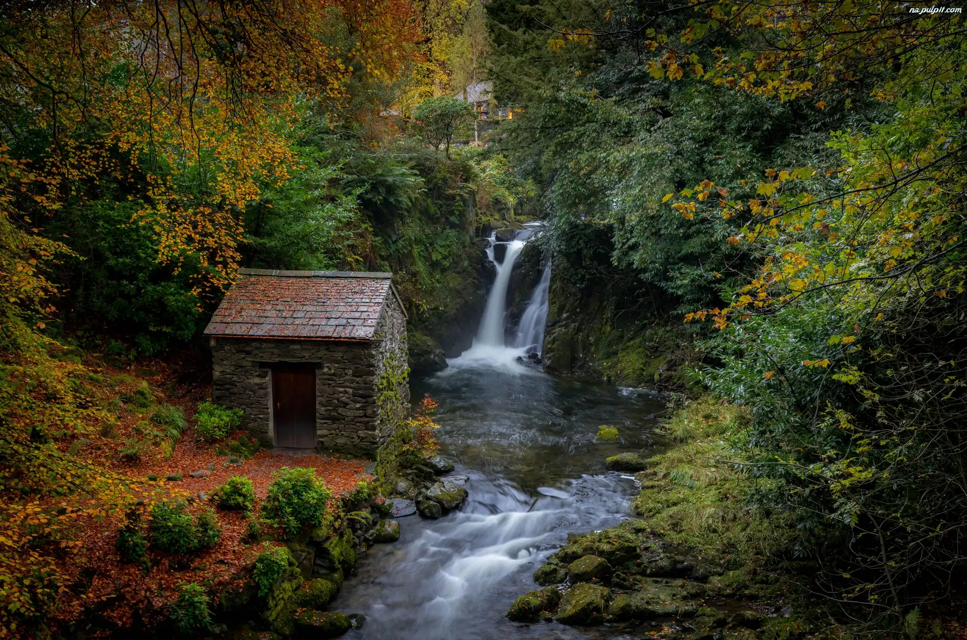 Anglia, Rzeka, Hrabstwo Kumbria, Wieś Rydal, Wodospad, Las, Dom widokowy Na Pulpit