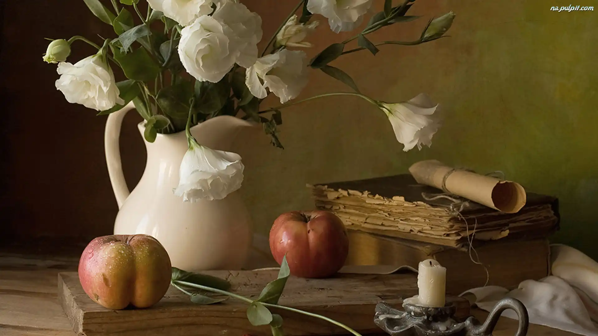 Świeca, Kwiaty, Jabłka, Stare, Dzbanek, Białe, Książki