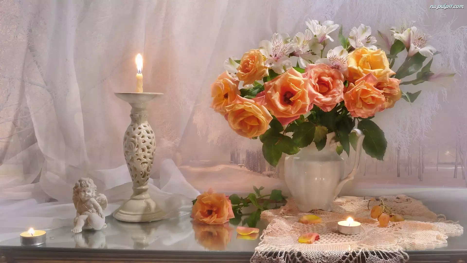 Figurka, Kwiaty, Róże, Alstremerie, Aniołek, Stół, Wazon, Kompozycja, Świeca