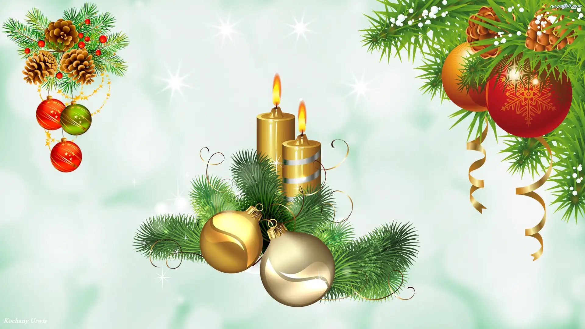 Świece, Gałązki, 2D, Bombki, Boże Narodzenie, Szyszki