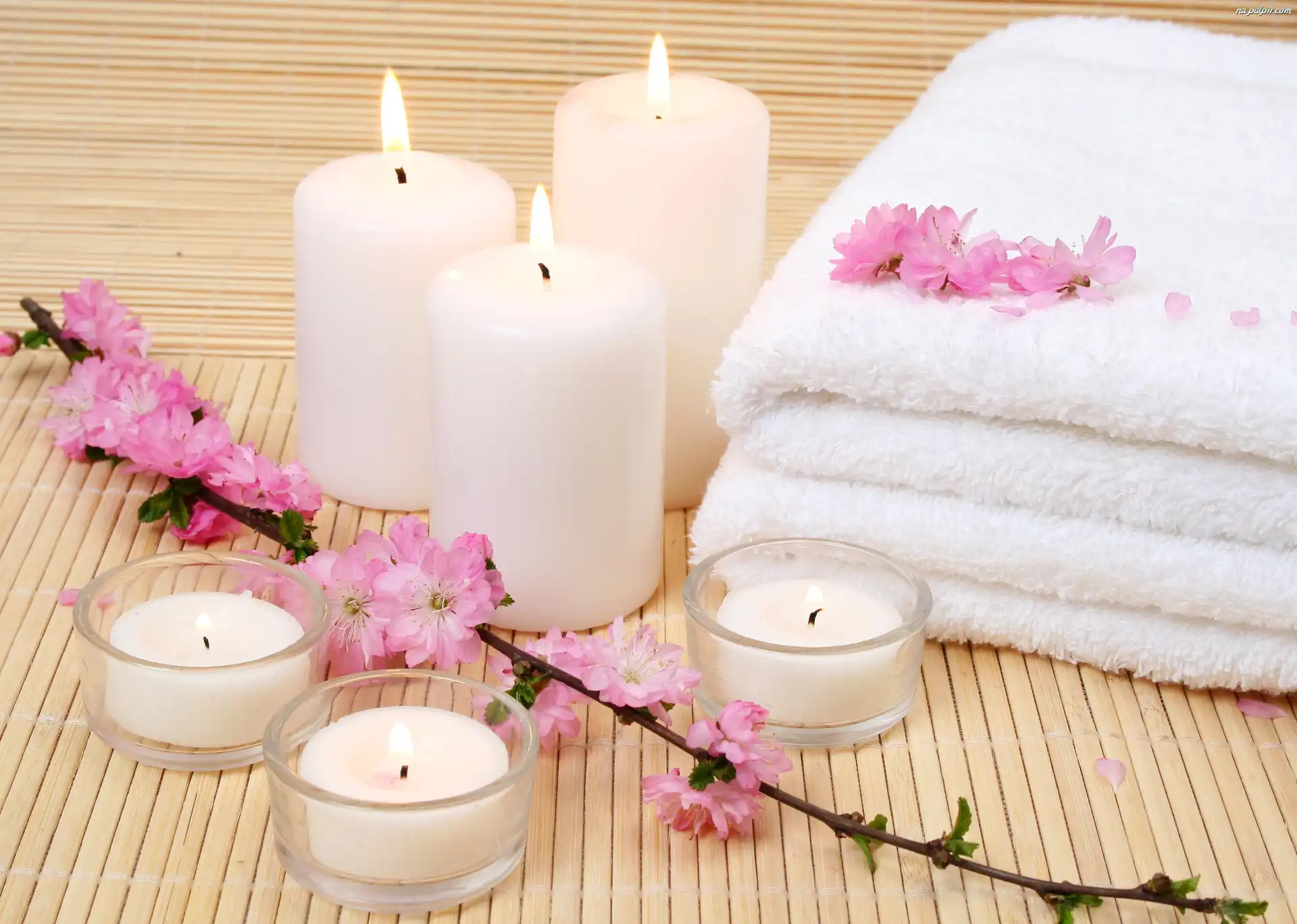 Świeczki, Kwiaty, Migdałek, SPA, Kompozycja, Ręczniki
