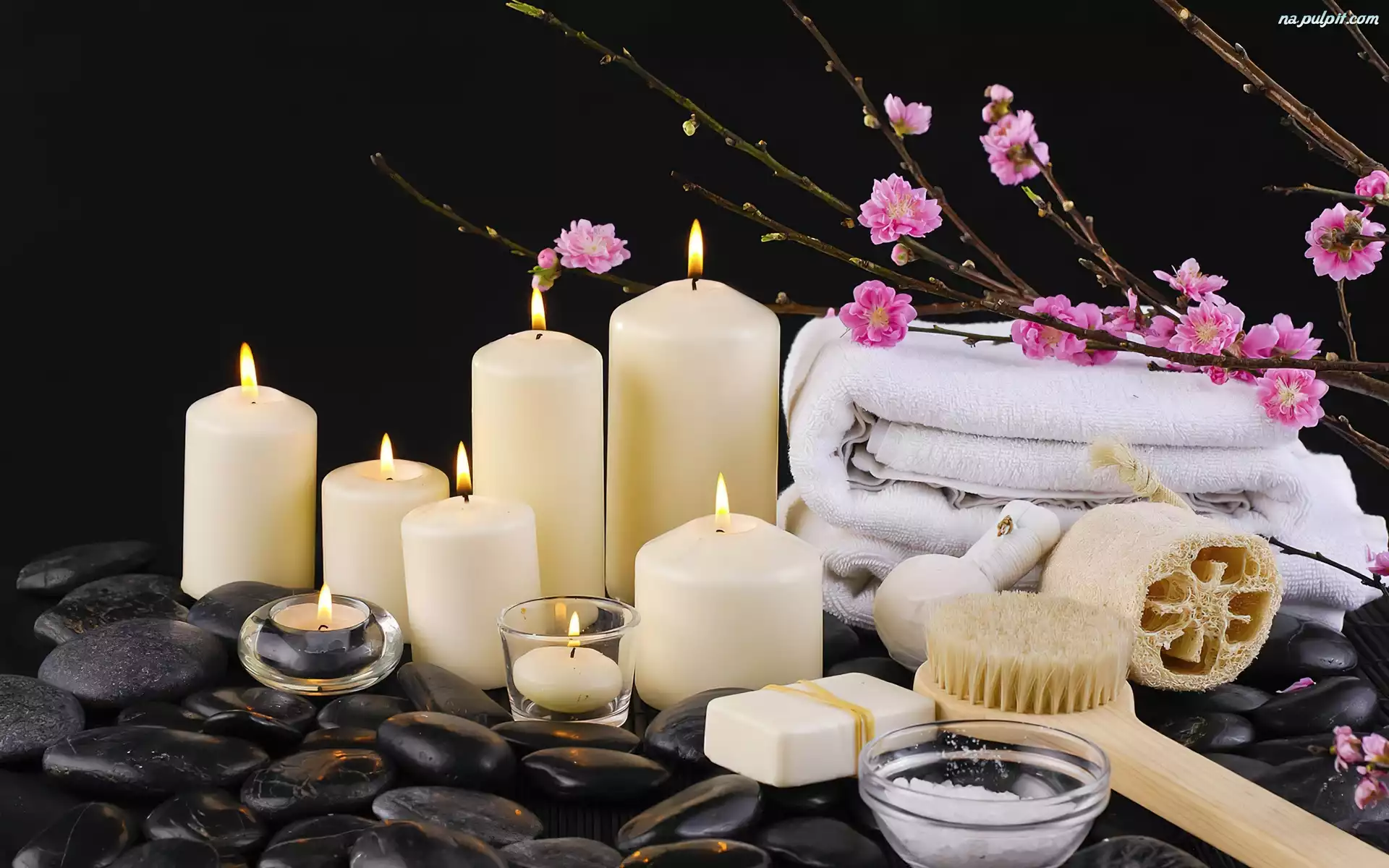 Kwiatki, Świeczki, Mydło, Kamienie, Ogień, Świece, Ręcznik