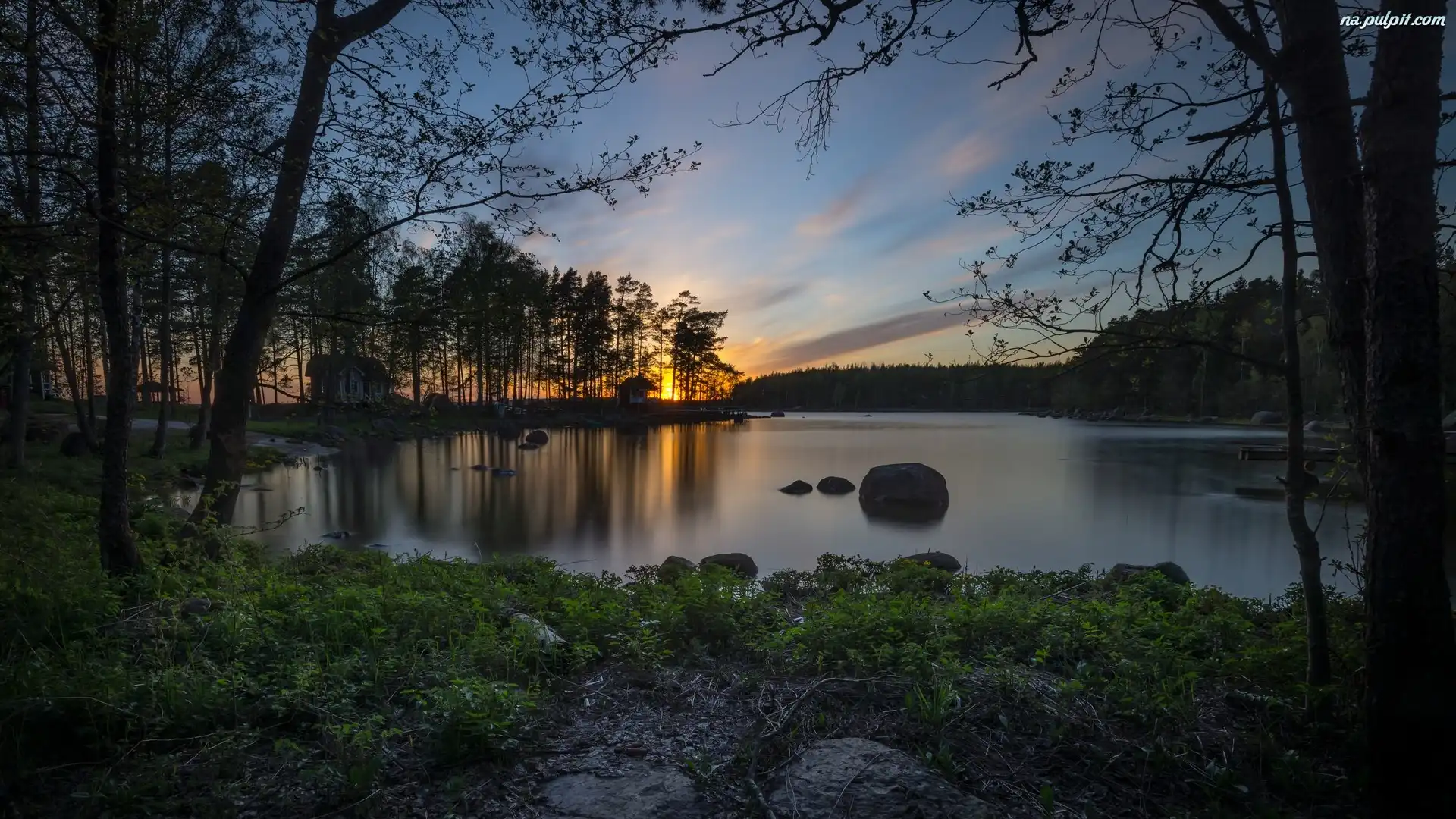 Domy, Wieś Niinilahti, Region Kymenlaakso, Wieczór, Zachód słońca, Finlandia, Jezioro Keitele, Drzewa Na Pulpit |