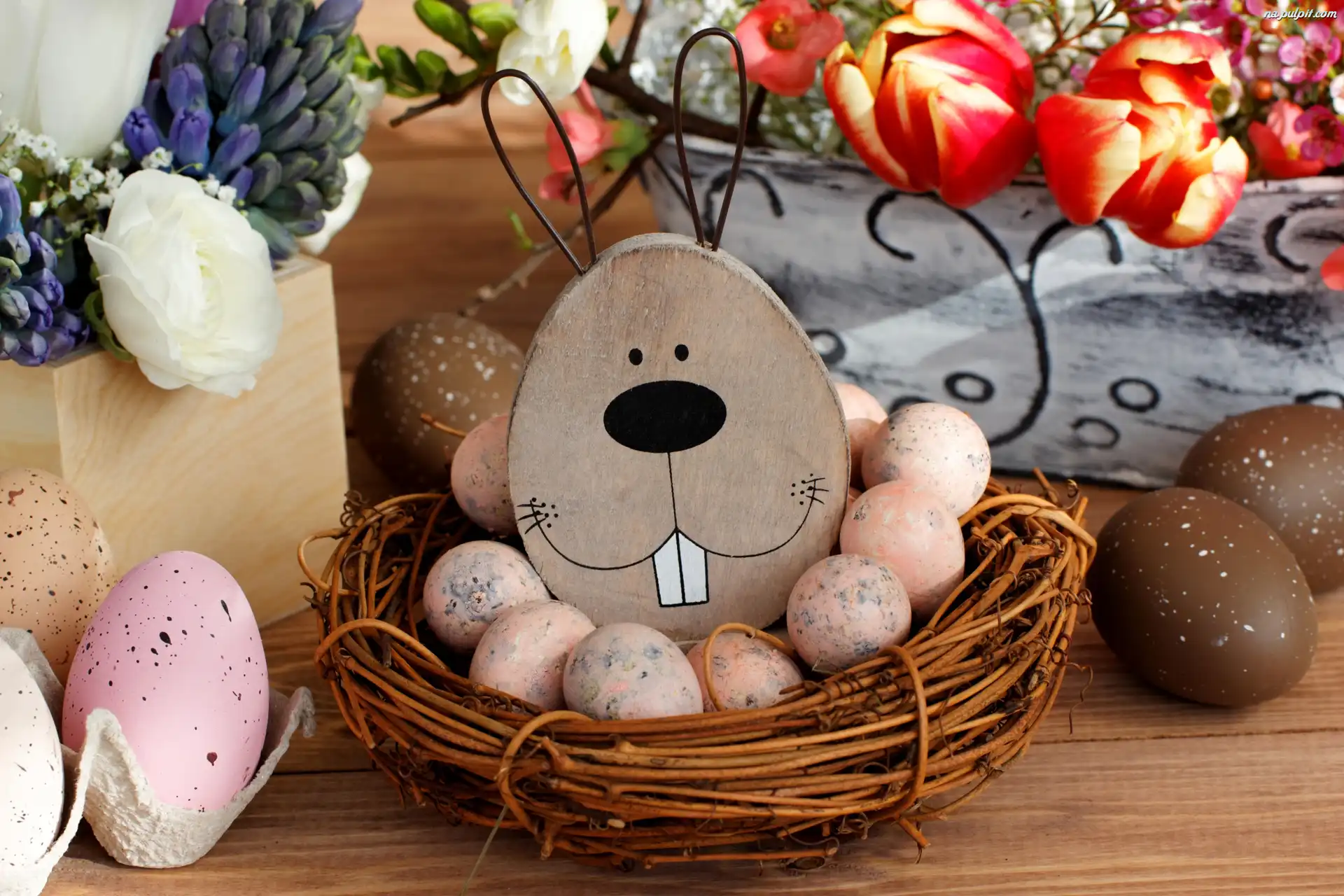 Wielkanoc, Jajka, Kwiaty, Koszyk, Dekoracja, ZajÄ…c Na Pulpit