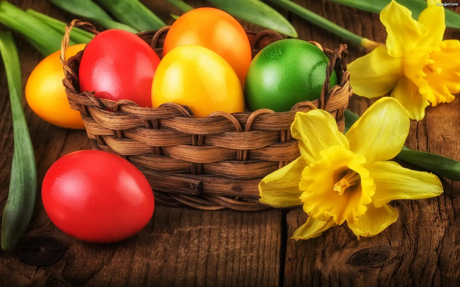 Żonkile, Kolorowe pisanki, Wielkanoc, Koszyk