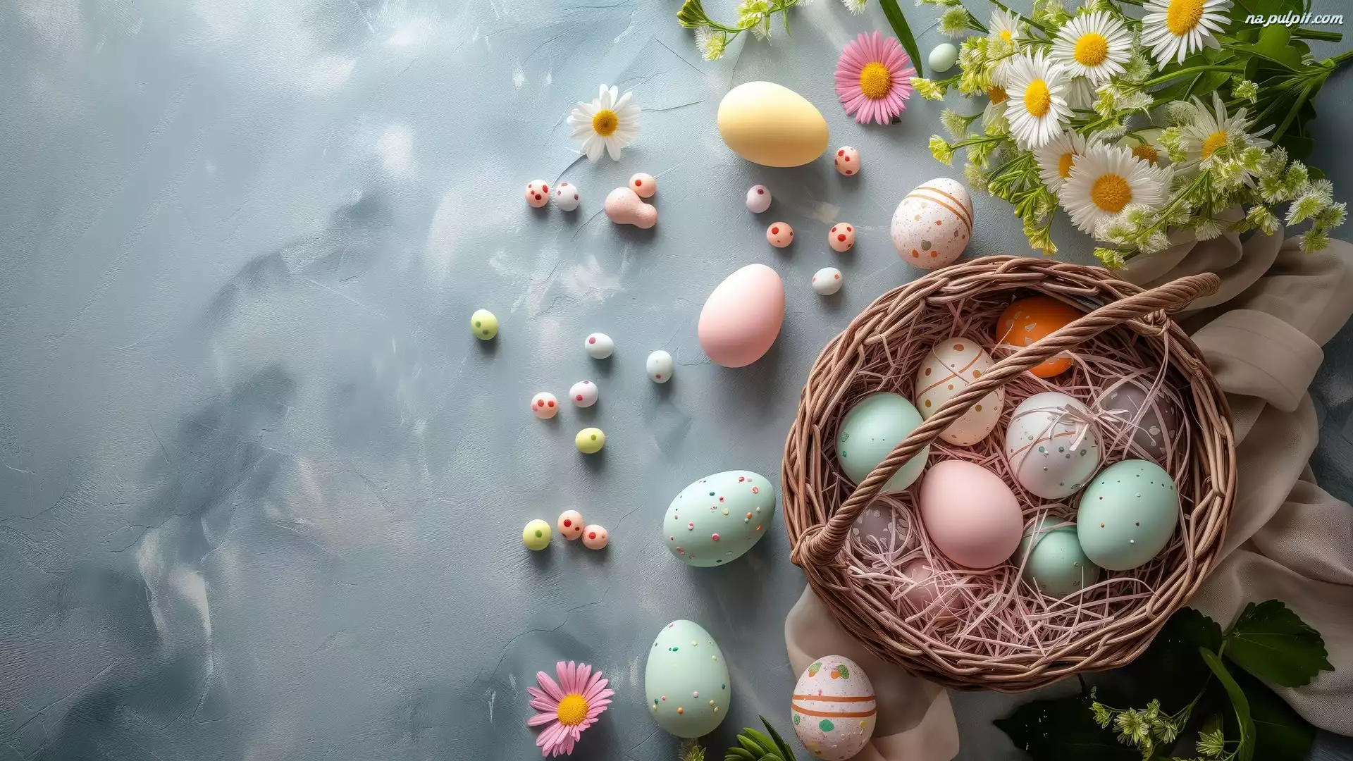 Kwiaty, Białe, Koszyk, Wielkanoc, Kolorowe, Pisanki, Różowe Na Pulpit