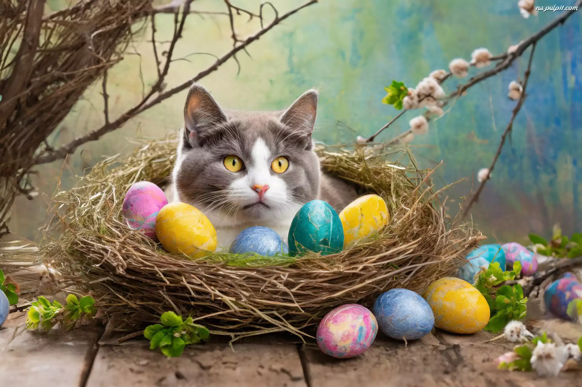 Gniazdko, Wielkanoc, Kot, Deski, Pisanki