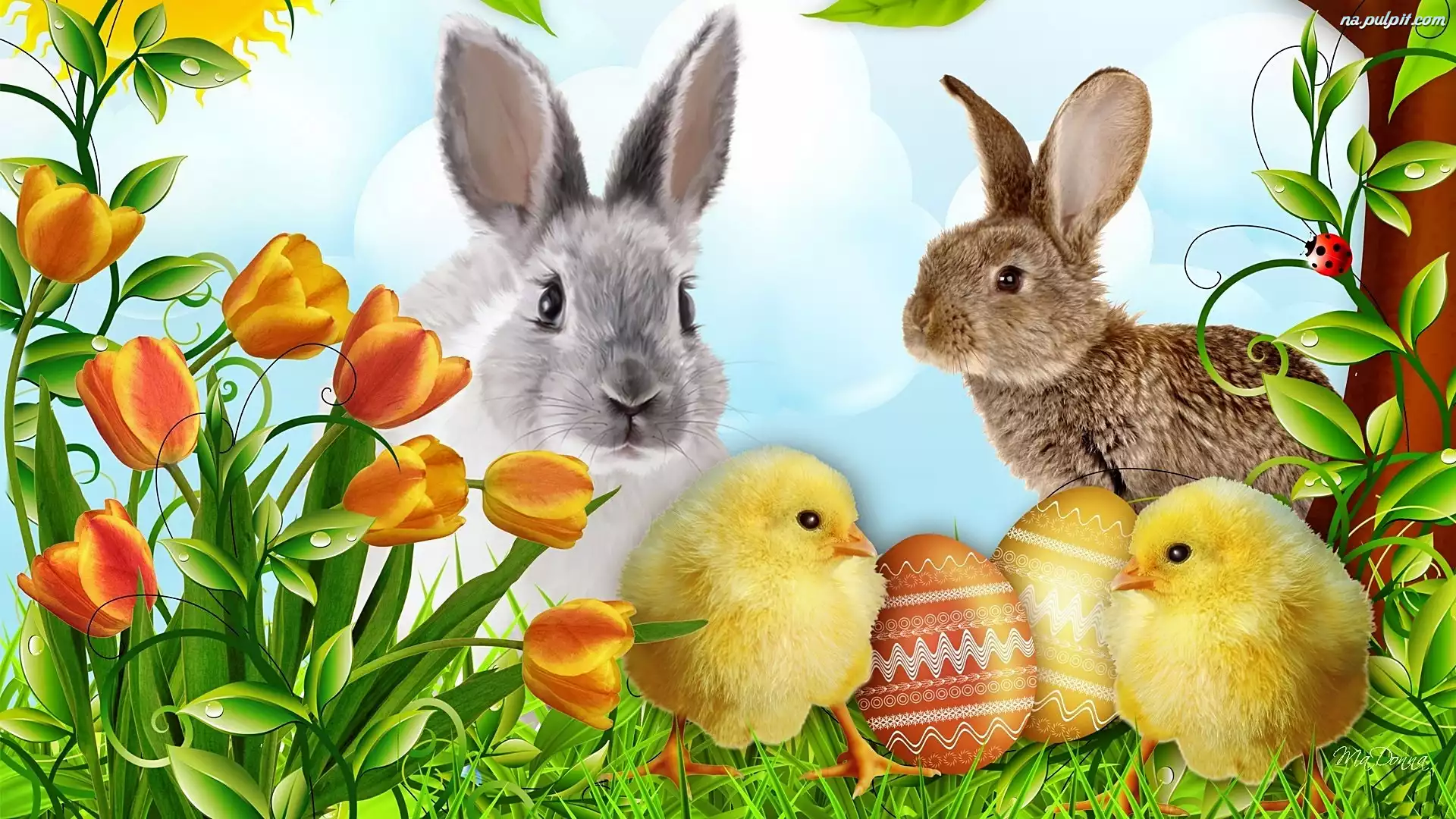 Wielkanoc, Jajka, Kurczaczki, Króliczki, Kwiaty