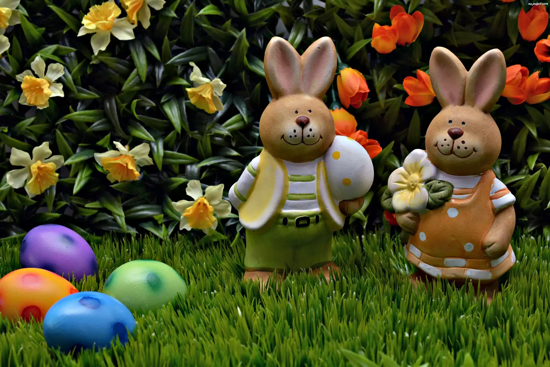 Wielkanoc, Żonkile, Pisanki, Króliczki, Tulipany