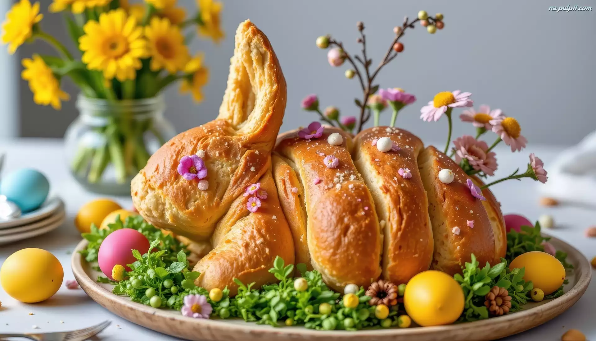 Stół, Jajka, Kwiaty, Wielkanoc, Królik, Chleb, Taca Na Pulpit