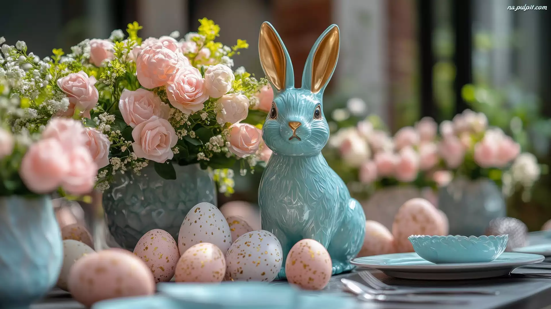 Grafika, Kwiaty, Pisanki, Wielkanoc, Figurka, Królik, Róże Na Pulpit