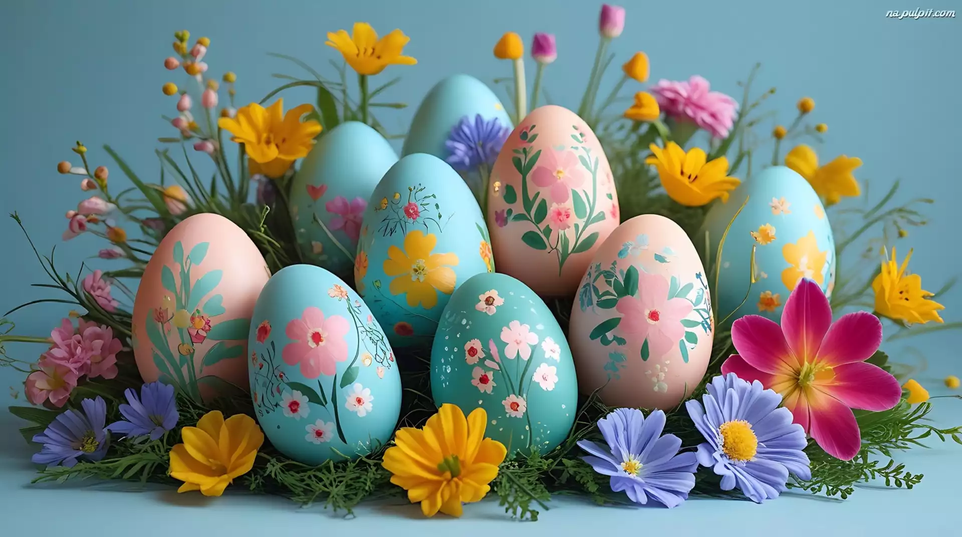 Niebieskie, Wielkanoc, Pisanki, Tło, Kwiaty