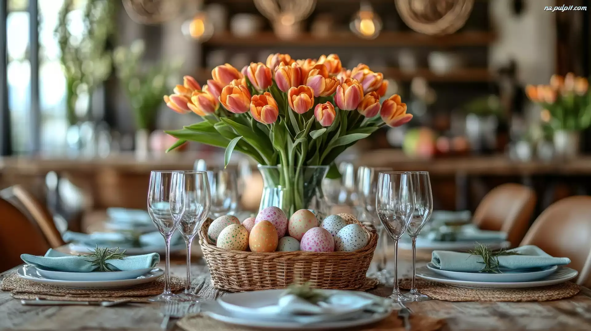 Kieliszki, Koszyczek, Tulipany, Wielkanoc, Stół, Wielkanocny, Pisanki