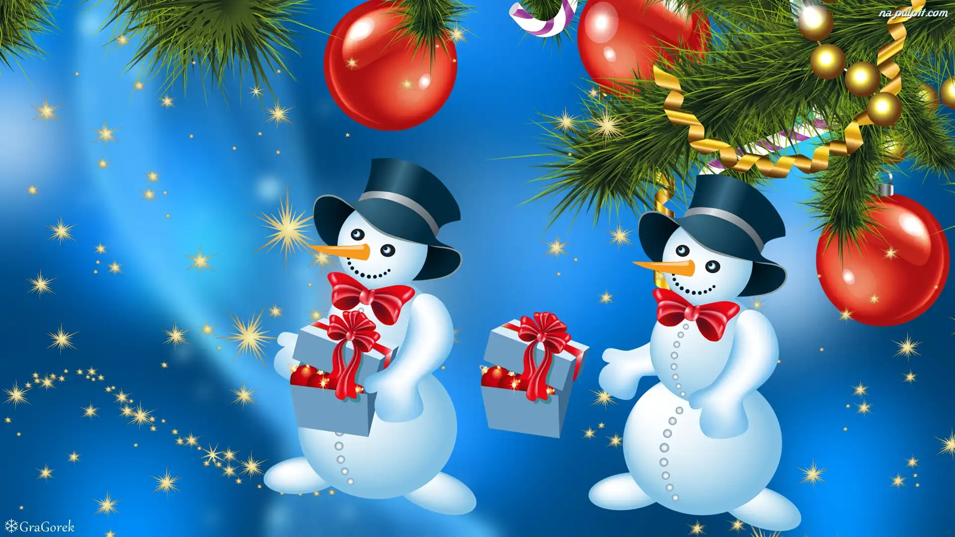 Świerk, Boże Narodzenie, Grafika, Bałwanki, Bombki, Prezenty Na Pulpit