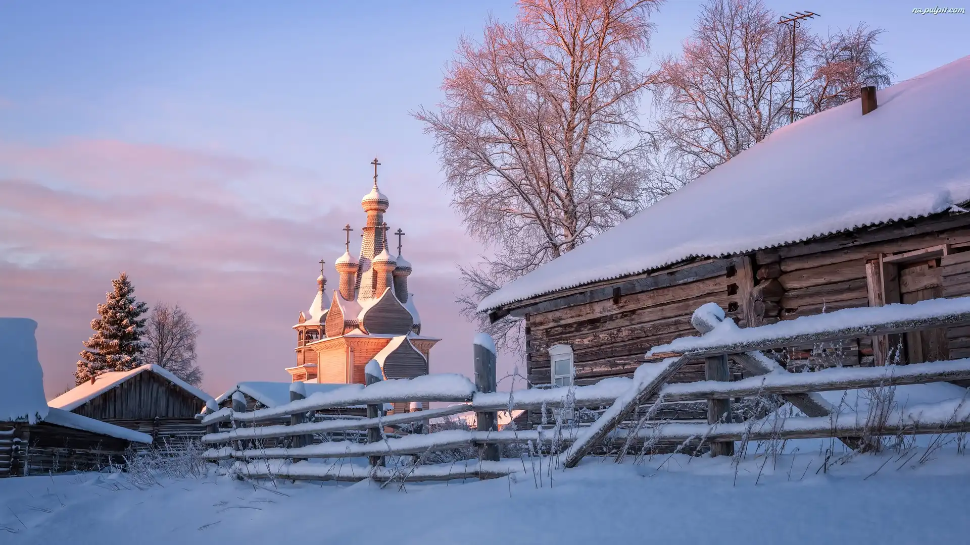 Szopa, Domy, Obwód archangielski, Zima, Śnieg, Wieś Kimzha, Rosja, Drzewa, Cerkiew