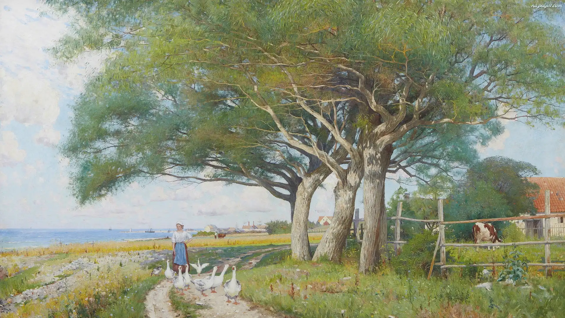 Obraz, Kobieta, Dom, Axel Lindman, Wieś, Ogrodzenie, Krowa, Drzewa, Gęsi, Malarstwo, Droga Na Pulpit |