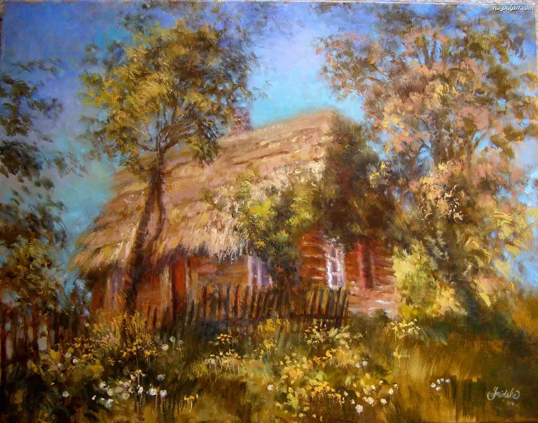 Wieś, Krystyna Jasińska, Obraz, Chatka