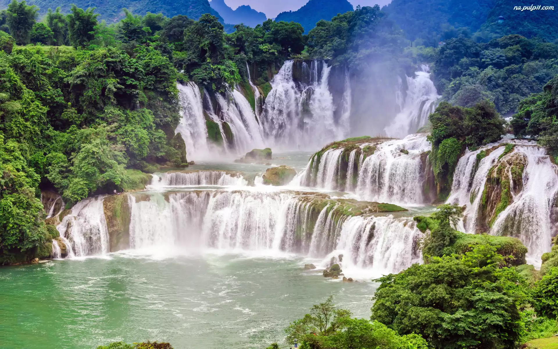 Wietnam, Rzeka, Jezioro, Wodospad, Ban Gioc Waterfall, Drzewa, Cao Bang Na Pulpit