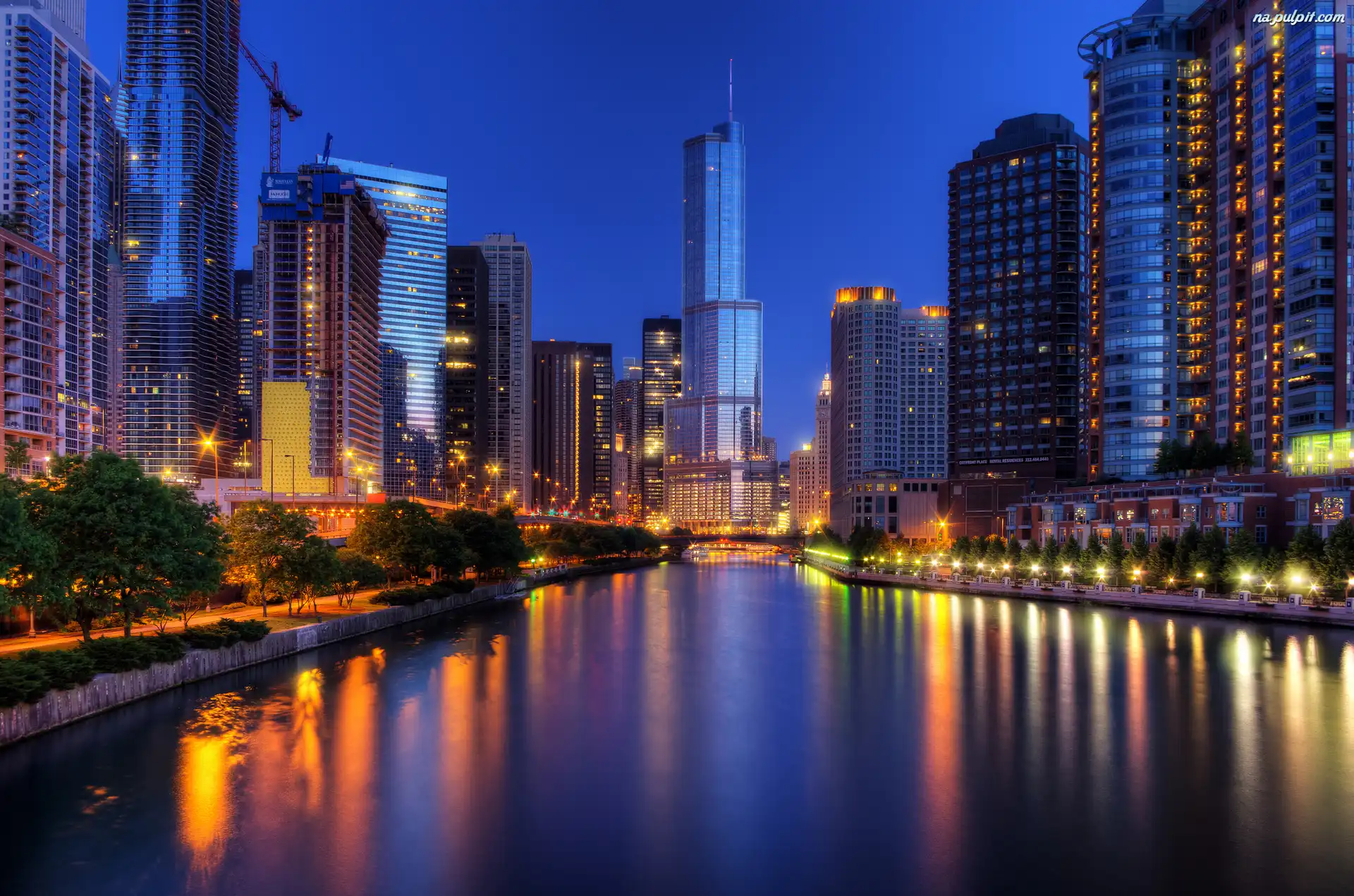 Wieżowce, Noc, Chicago, Rzeka Na Pulpit