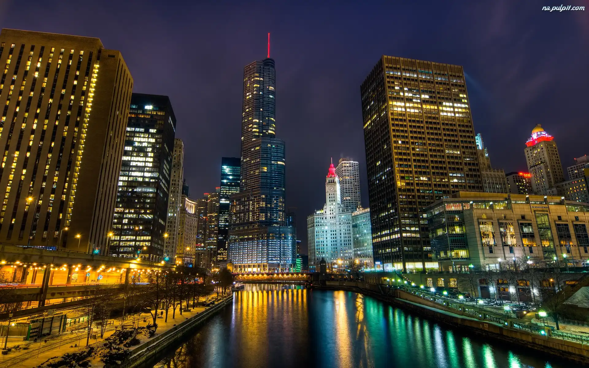 Wieżowce, Noc, Miasto, Oświetlone Na Pulpit