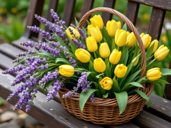 Ławka, Tulipany, Żółte, Wiklinowy, Koszyk, Kwiaty, Lawenda Na Pulpit