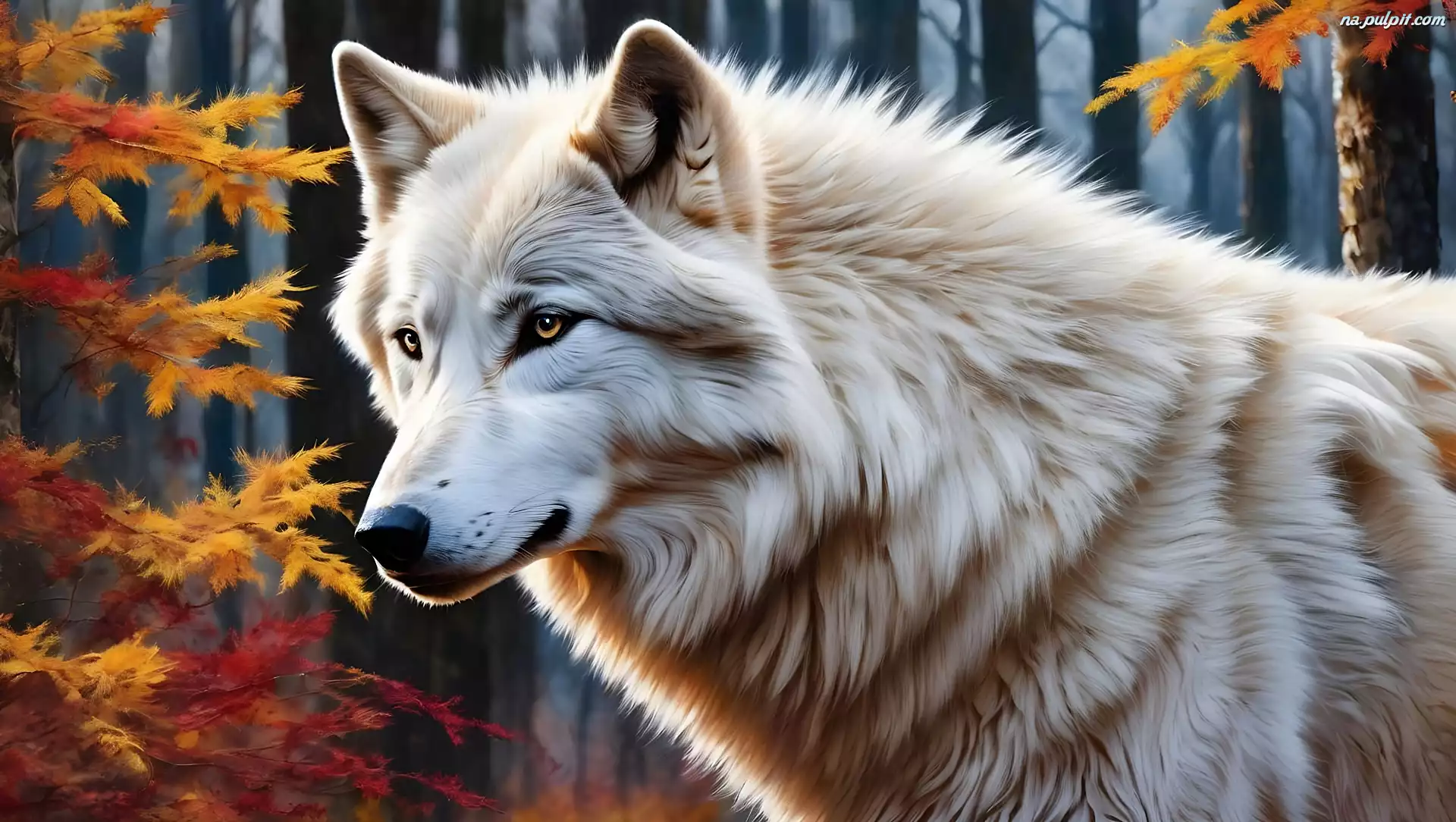 Jesień, Wilk, Biały, Grafika, Las Na Pulpit