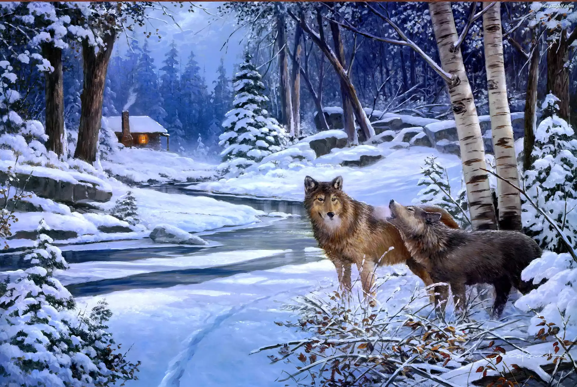 Potok, Sceneria, Zimowa, Domek Donal Zolan, Dziewczynka, Woda Noc, Las, Wilk, Rzeka Obraz, Olejny Wilk, Fractalius Wilk Czarny Wilk Wilki Wilk, szczeniak Marta Dahlig, Żądza Night, The, Vincent Van Gogh, Starry Dona Gelsinger, Aniołki, Dziewczynki, Dwie, Króliczek Kły, Wilki, Pyszczki Joyeusetés, Gauguin, Paul Arearea